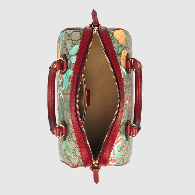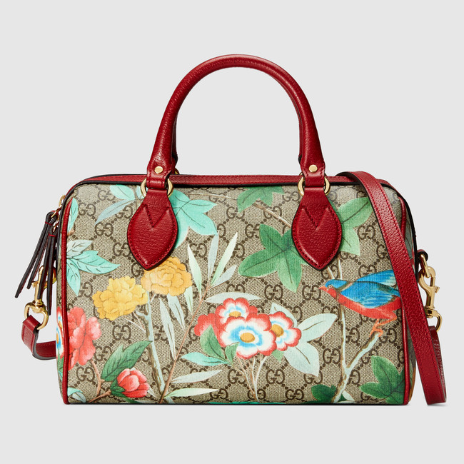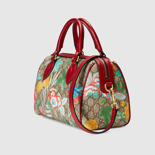 A small size boston bag made in our GG Supreme Tian canvas. The handles have been hand-stitched with a padded base. Our new Gucci Tian print features a contemporary floral motif inspired by Chinese landscapes depicted on 18th-century tapestries and screens. The floral pattern is made up of flowers, insects and birds-including dragonflies, butterflies and hummingbirds. The plants and creatures are represented through light and quick brushstroke-style graphics, with a three-dimensional effect printed on our GG Supreme canvas.