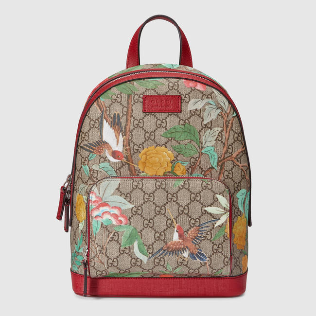 A small sized backpack with leather details and green and red adjustable shoulder straps. Made in our GG Supreme tian canvas. Our new Gucci Tian print features a contemporary floral motif inspired by Chinese landscapes depicted on 18th-century tapestries and screens. The floral pattern is made up of flowers, insects and birds-including dragonflies, butterflies and hummingbirds. The plants and creatures are represented through light and quick brushstroke-style graphics, with a three-dimensional effect printed on our GG Supreme canvas.