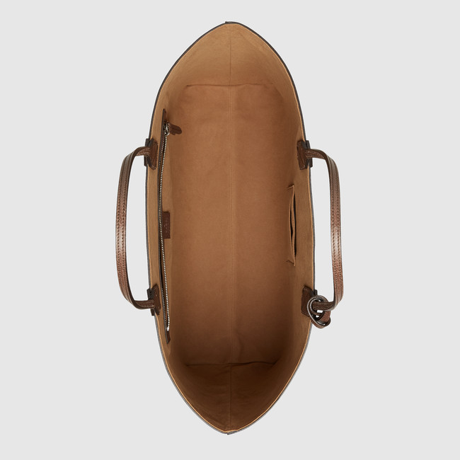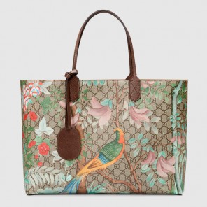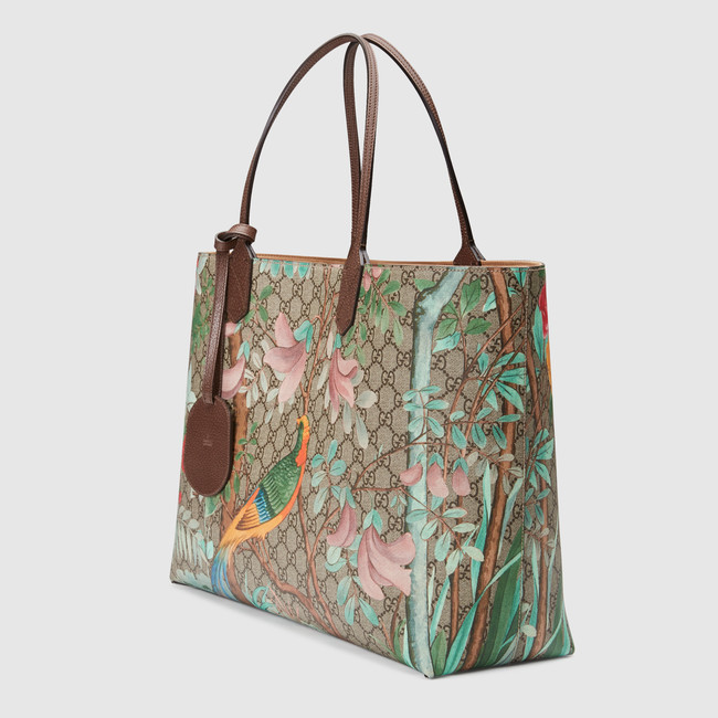 A large tote with double handles and an ID tag, made in our GG Supreme Tian canvas. Our new Gucci Tian print features a contemporary floral motif inspired by Chinese landscapes depicted on 18th-century tapestries and screens. The floral pattern is made up of flowers, insects and birds-including dragonflies, butterflies and hummingbirds. The plants and creatures are represented through light and quick brushstroke-style graphics, with a three-dimensional effect printed on our GG Supreme canvas.