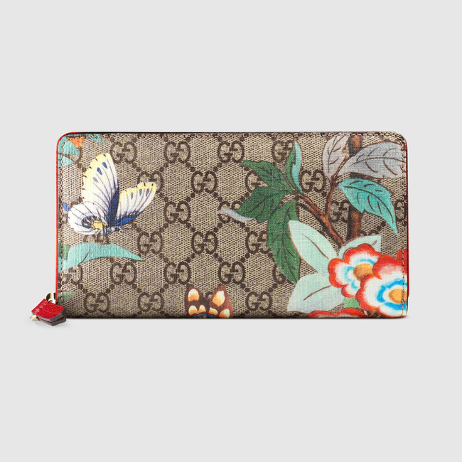 A zip around wallet made in our GG supreme tian canvas. Our new Gucci Tian print features a contemporary floral motif inspired by Chinese landscapes depicted on 18th-century tapestries and screens. The floral pattern is made up of flowers, insects and birds-including dragonflies, butterflies and hummingbirds. The plants and creatures are represented through light and quick brushstroke-style graphics, with a three-dimensional effect printed on our GG Supreme canvas.