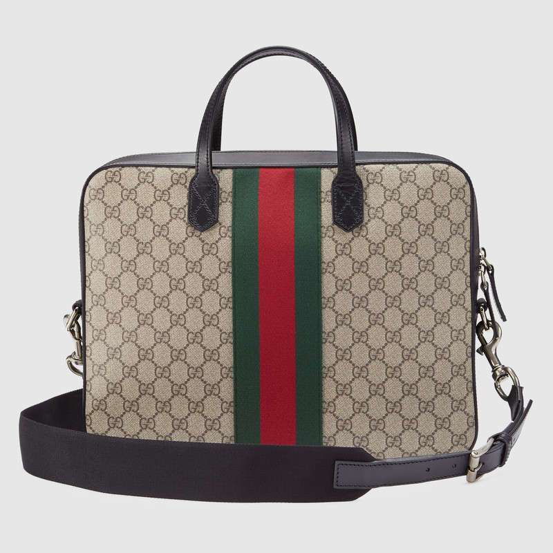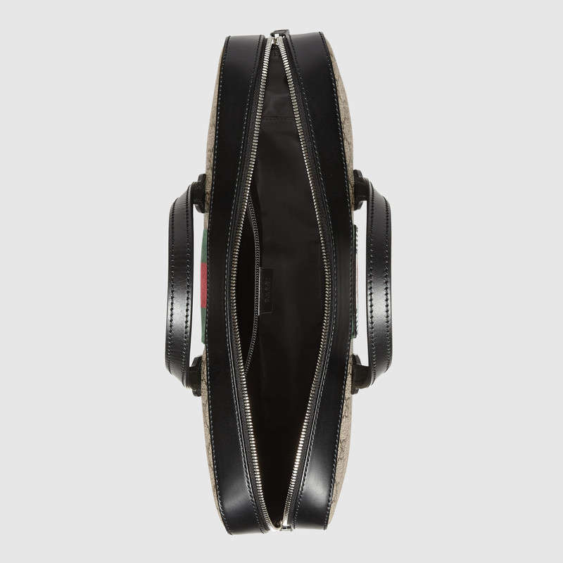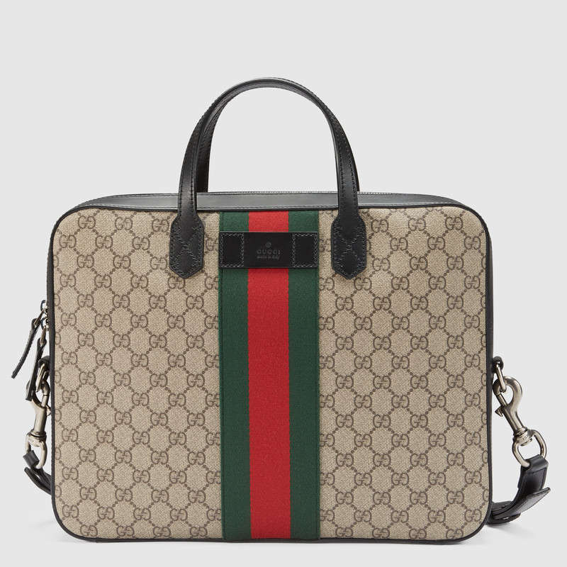 A slim briefcase, equipped with double leather handles and removable shoulder strap. Made in our signature GG Supreme canvas with green and red Web detail.