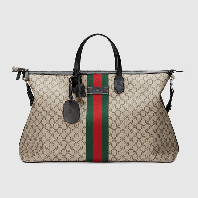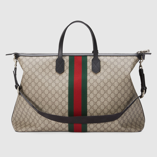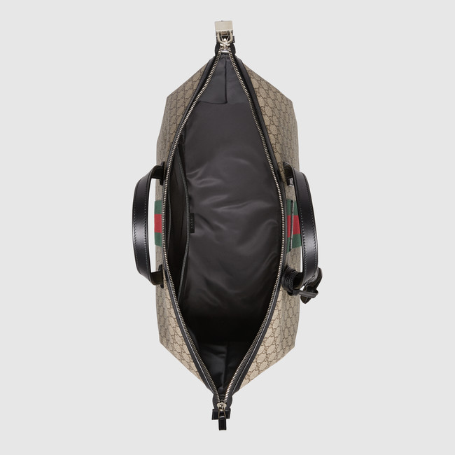 A large duffle with a secure zip closure. Equipped with double leather handles and an adjustable shoulder strap. Made in our signature GG Supreme canvas with green/red/green web detail.