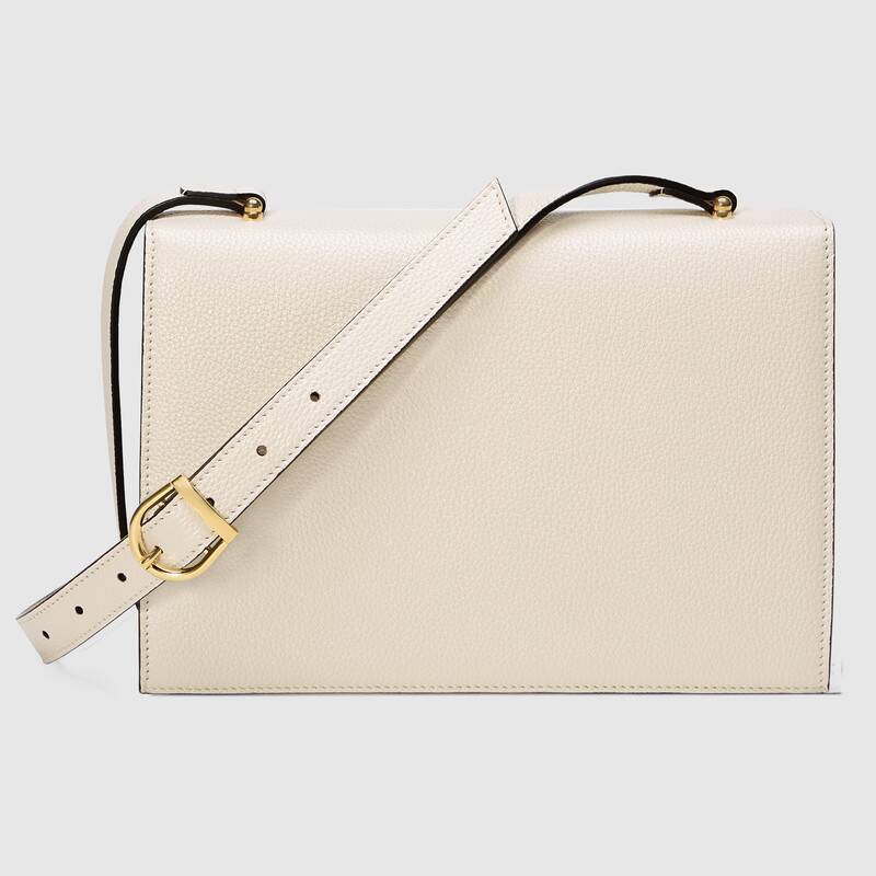 A new shape introduced to the Gucci Zumi line for Pre-Fall 2019, the small shoulder bag in white grainy leather is enriched with the collection's distinctive Interlocking G Horsebit. Gucci continues to bring House icons to the forefront in unexpected ways, merging two of its codes into one symbol in a modern mix of silver and gold tones. First presented in Spring Summer 2019, Gucci Zumi takes its name from actress and experimental musician Zumi Rosow, who walked the runway carrying the bag. The shoulder bag has a flap with a special bar closure that open when both sides are pushed in together.