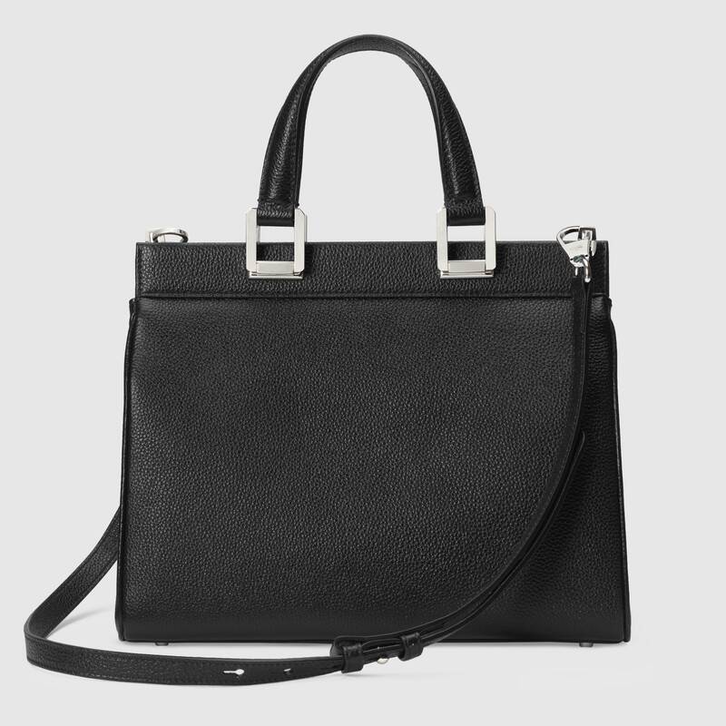 Introduced in the evocative setting of the Theatre Le Palace in Paris, the Gucci Zumi line takes its name from actress and experimental musician Zumi Rosow, who walked the Spring Summer 2019 runway carrying the bag. Merging two of its most distinctive codes into one symbol: the Interlocking G Horsebit, the hardware is replicated from a rare piece from the Gucci archives, chosen for its contemporary appeal and presented in a mix of silver and gold tones on a grainy leather top handle bag. A detachable strap creates multifunctionality, doubling as a shoulder bag, while the top opening frame features a hinged lock on each side for a secure closure.