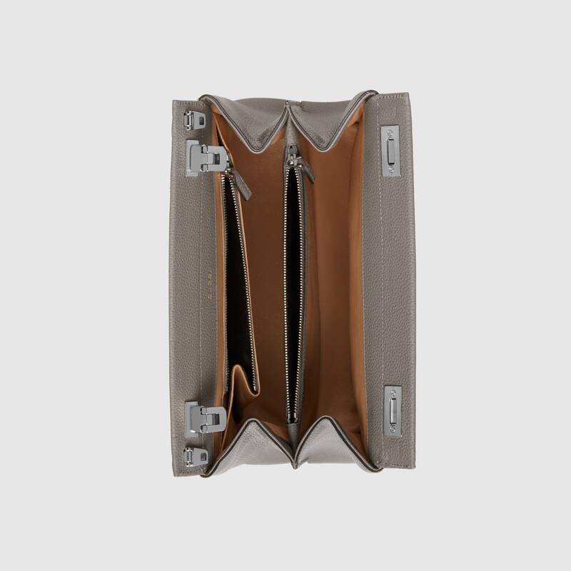 Introduced in the evocative setting of the Theatre Le Palace in Paris, the Gucci Zumi line takes its name from actress and experimental musician Zumi Rosow, who walked the Spring Summer 2019 runway carrying the bag. Merging two of its most distinctive codes into one symbol: the Interlocking G Horsebit, the hardware is replicated from a rare piece from the Gucci archives, chosen for its contemporary appeal and presented in a mix of silver and gold tones on a grainy leather top handle bag. A detachable strap creates multifunctionality, doubling as a shoulder bag, while the top opening frame features a hinged lock on each side for a secure closure.