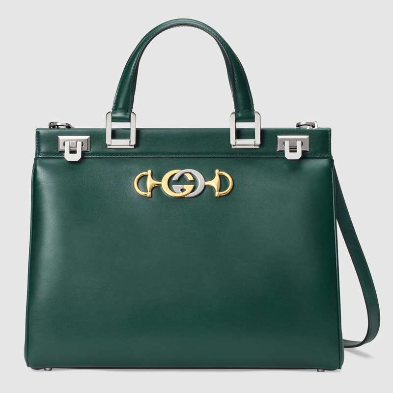 Gucci continues to bring House icons to the forefront in unexpected ways, merging two of its most distinctive codes into one symbol: the Interlocking G Horsebit. The hardware is presented in a modern mix of silver and gold tones on a grainy leather top handle bag. A detachable strap creates multifunctionality, doubling as a shoulder bag, while the top opening frame features a hinged lock on each side for a secure closure. The Gucci Zumi line takes its name from actress and experimental musician Zumi Rosow – unconventional and modern, and at the same time evoking an inherent free spirit – Zumi's individual look creates an unexpected contrast to the structured, refined details of the bag.