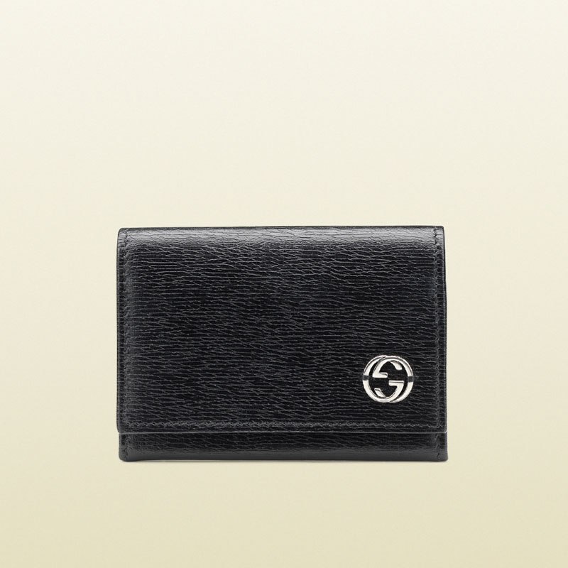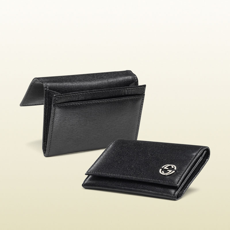 - black leather- palladium hardware- interlocking G detail- 3.9"W x 2.8"H