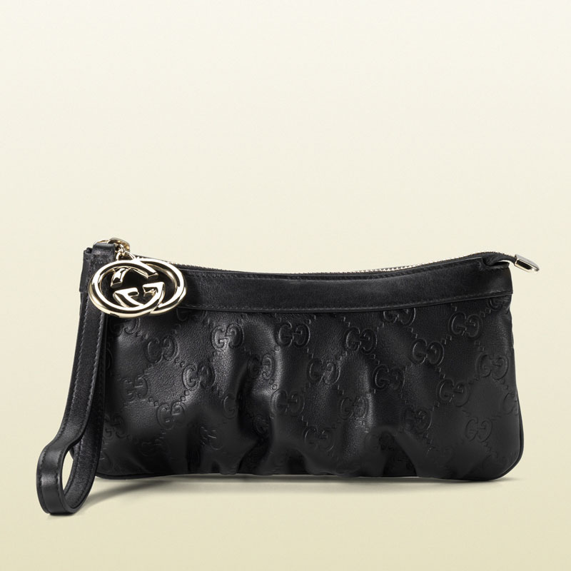 - black guccissima leather with black leather trim- light gold hardware- interlocking G charm- zip-top closure with leather pull- 8.7"W x 4.3"H