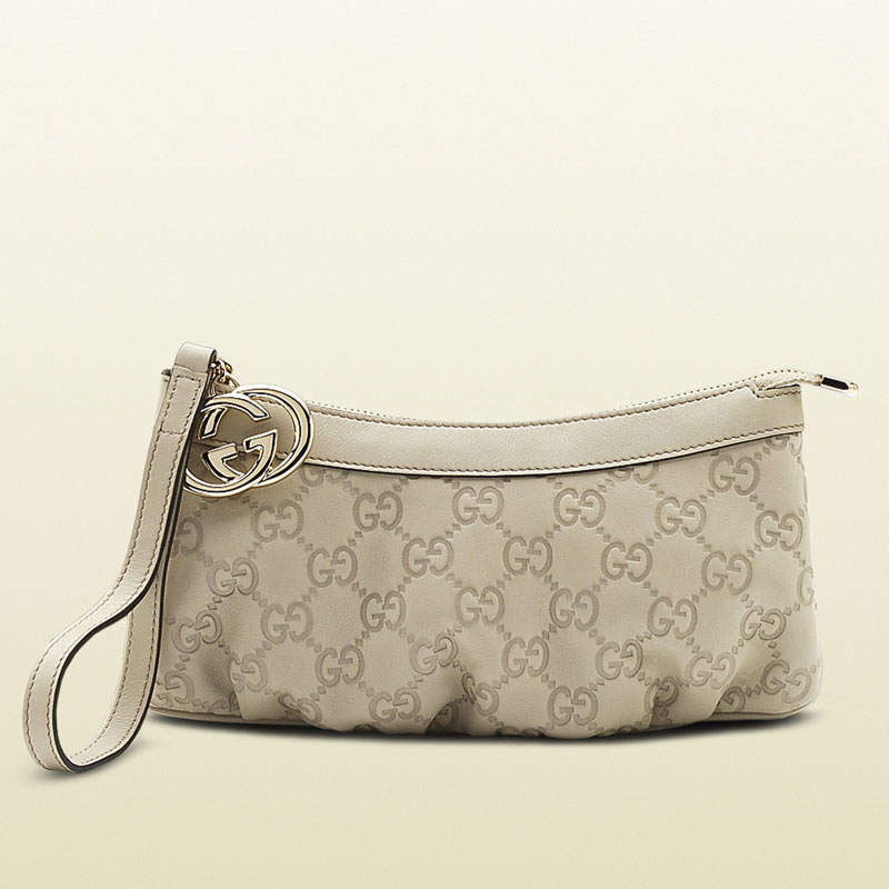 - off-white guccissima leather with off-white leather trim- light gold hardware- interlocking G charm- zip-top closure with leather pull- 8.7"W x 4.3"H