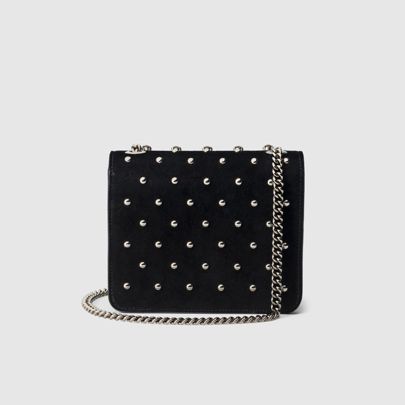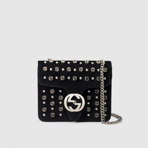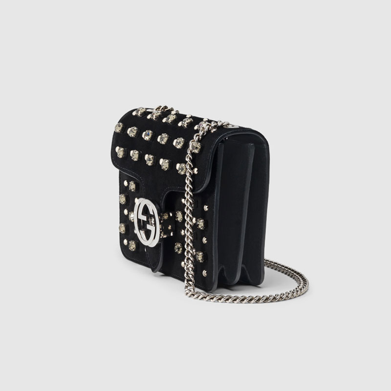 the house's initials adorn the front of this sleek chain shoulder bag for a sophisticated look. each stud and crystal is hand-applied on our smooth black suede.