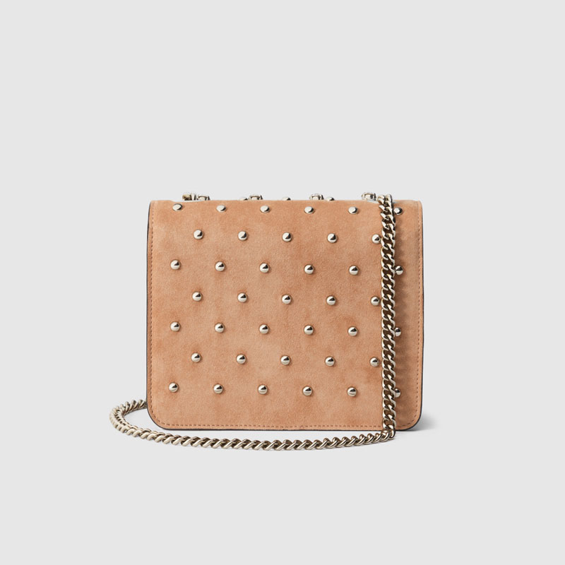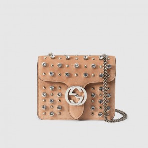 the house's initials adorn the front of this sleek chain shoulder bag for a sophisticated look. each stud and crystal is hand-applied on our smooth black suede.