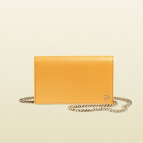 - yellow leather- detachable metal chain with 19.5" drop- interior zip pocket with ten card slots