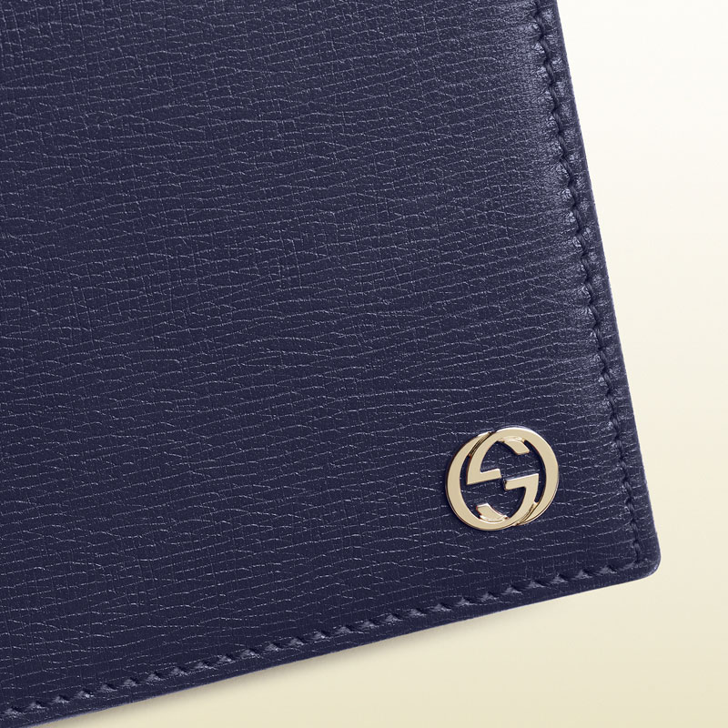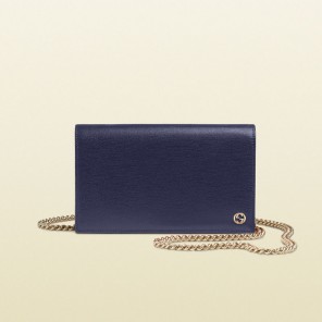 - blue leather- detachable metal chain with 19.5" drop- interior zip pocket with ten card slots