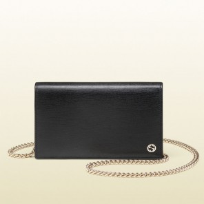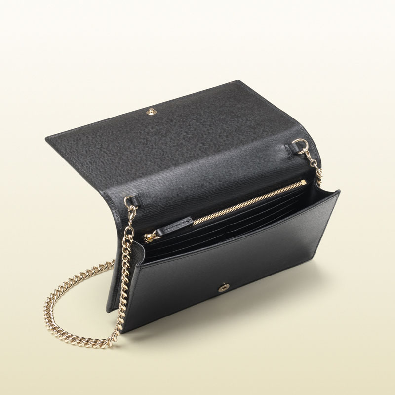 - black leather- detachable metal chain with 19.5" drop- interior zip pocket with ten card slots