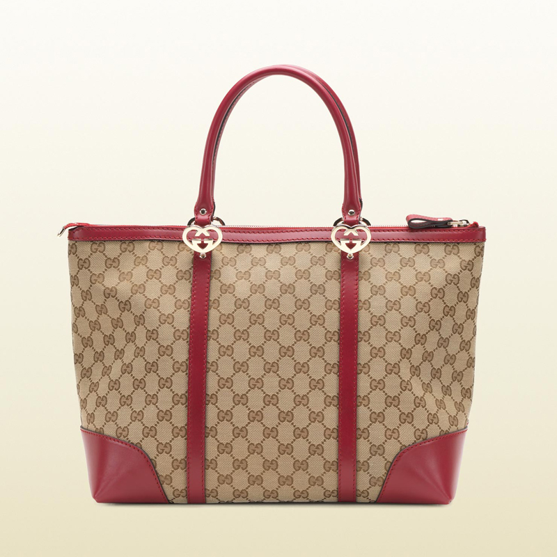 - heart-shaped interlocking G hardware at straps and base