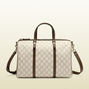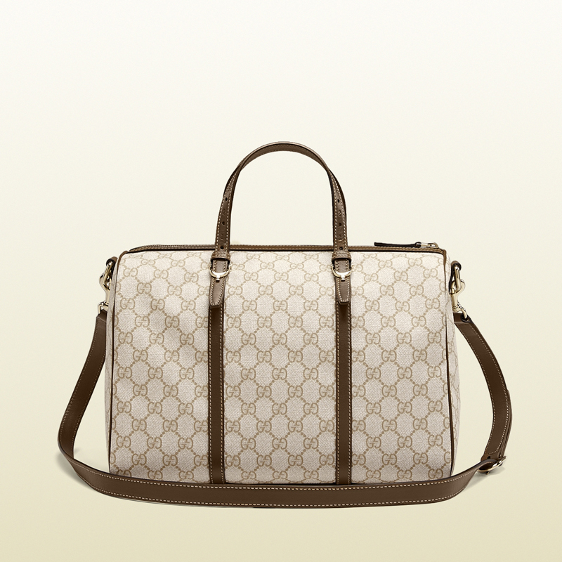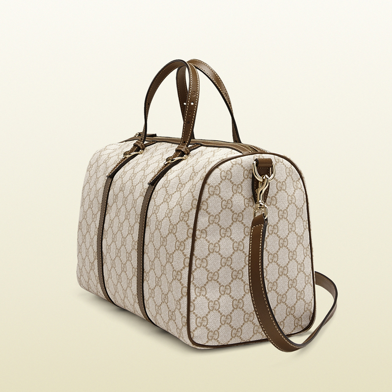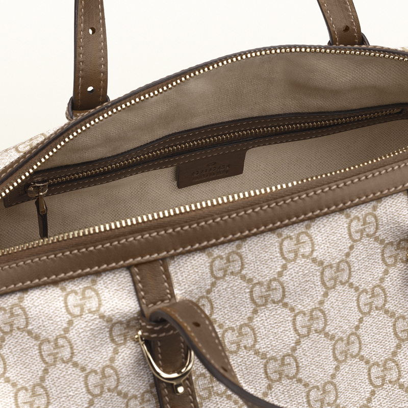 - off-white/beige GG supreme canvas, made using an earth-conscious process, with maple brown leather detail