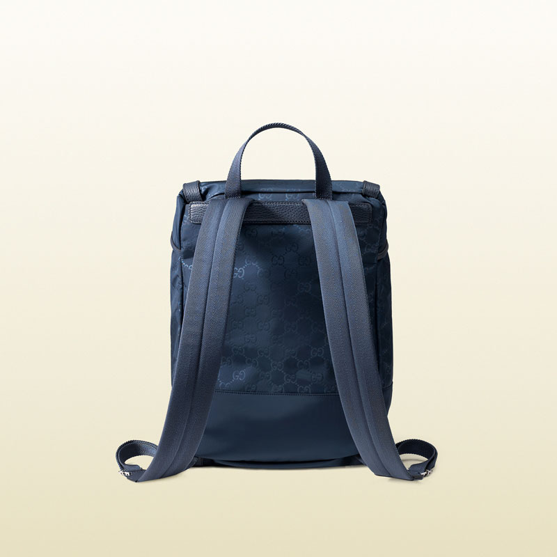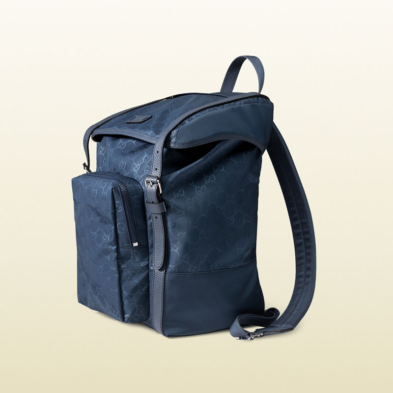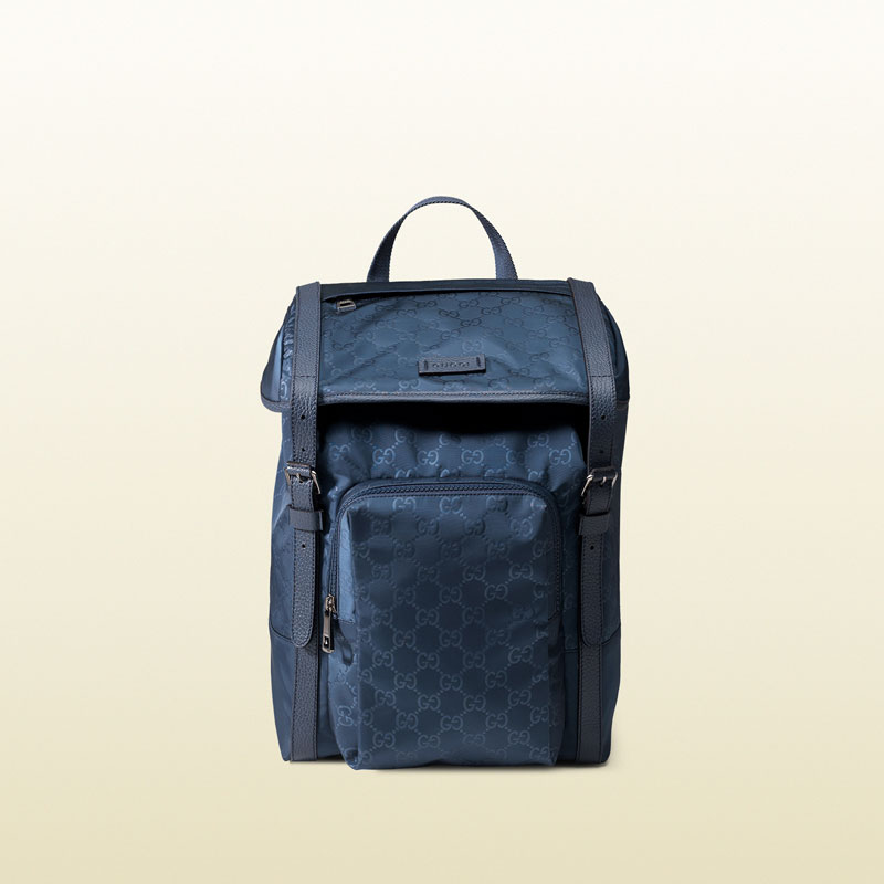 An essential addition to our lifestyle collection, this backpack is crafted from our new nylon guccissima light, a featherweight fabric with a contemporary attitude due to its silky sheen, deep color and iconic GG motif. Leather trims add an elevated touch.