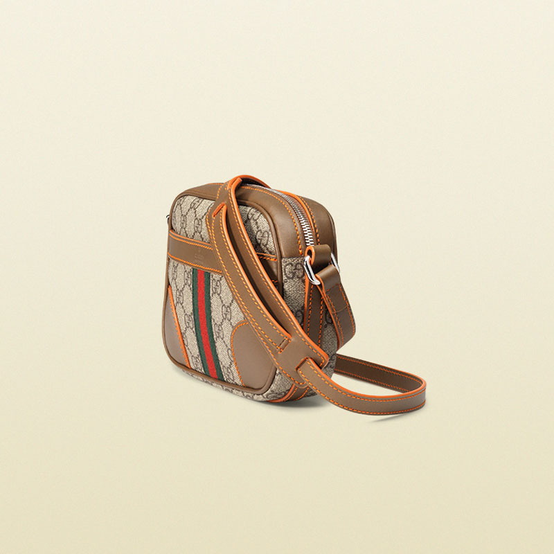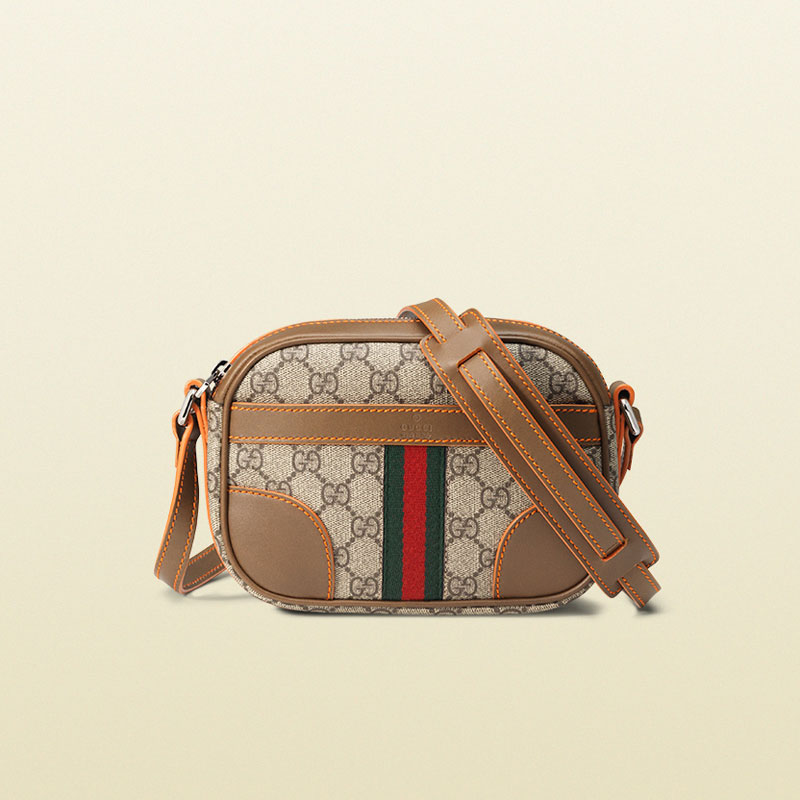 A new shoulder bag silhouette inspired by camera cases. Offered in our signature GG supreme, this style is trimmed with leather and neon orange details, finished with our unmistakable green/red/green web.