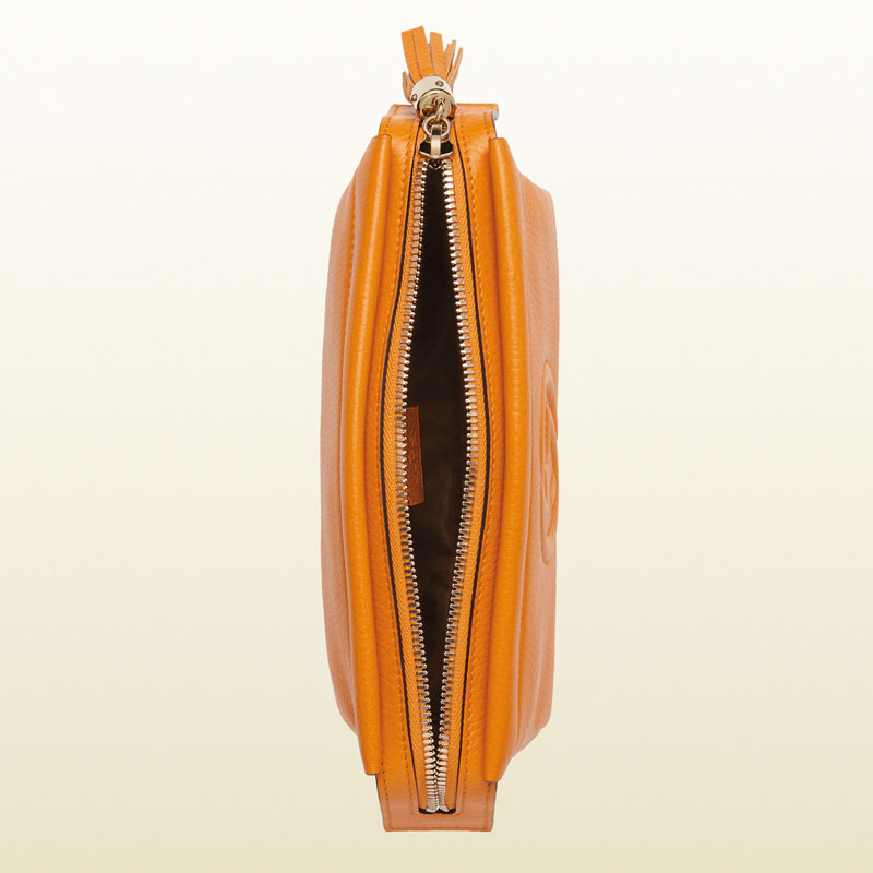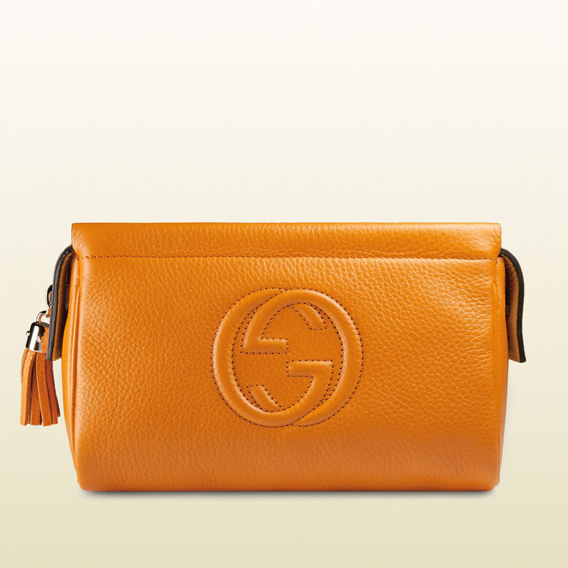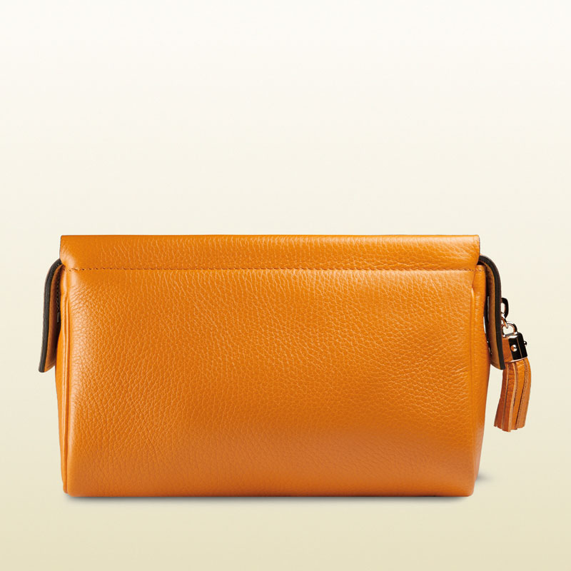 - dark yellow leather- embossed interlocking G detail- tassel detail- one inside pocket- zip top- 8.5"W x 5"H x 2.7"D