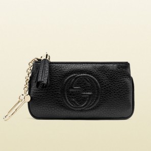 - black leather- embossed interlocking G detail- tassel detail- 5"W x 2.7"H x .5"D
