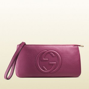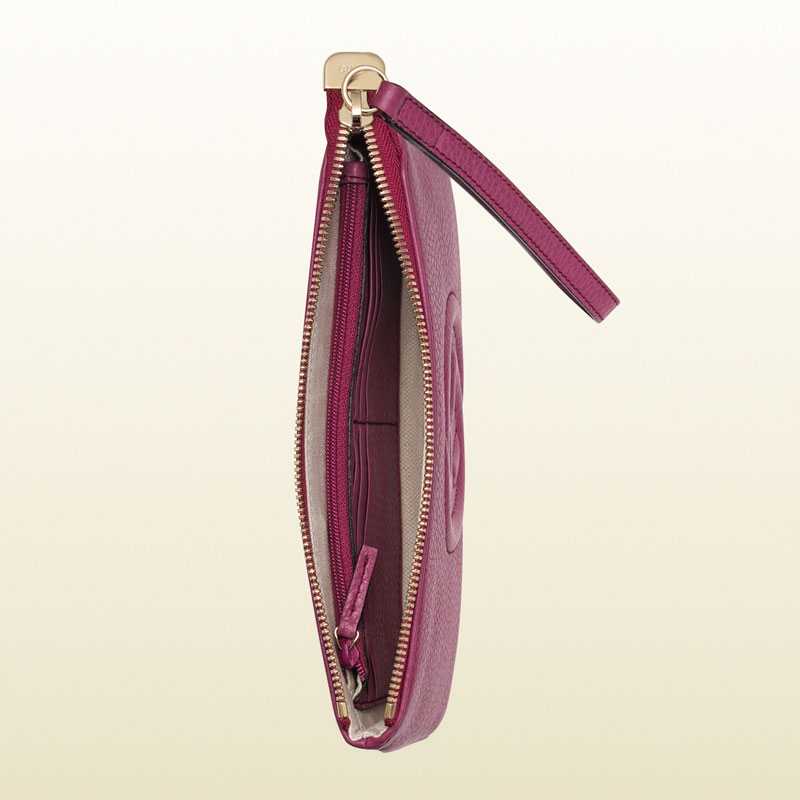- dusty rose leather- embossed interlocking G detail- top zip closure with coordinating leather pull- 8.9"W x 4.7"H x .6"D