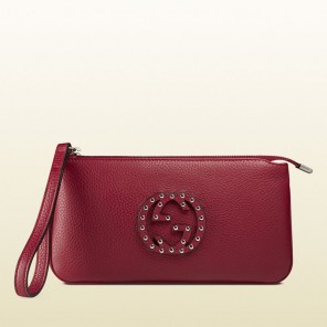 - bordeaux leather with studs- embossed interlocking G detail- top zip closure with coordinating leather pull- 8.9"W x 4.7"H x .6"D