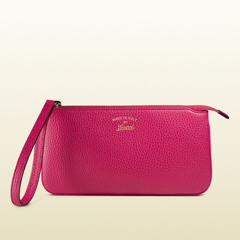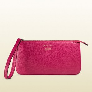 - fuchsia leather- embossed gold gucci trademark- top zip closure with coordinating leather pull- 8.9"W x 4.7"H x 1"D