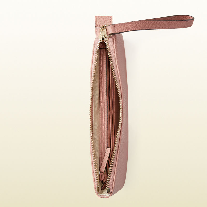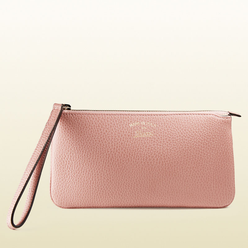 - bright pink leather- embossed gold gucci trademark- top zip closure with coordinating leather pull- 8.9"W x 4.7"H x 1"D