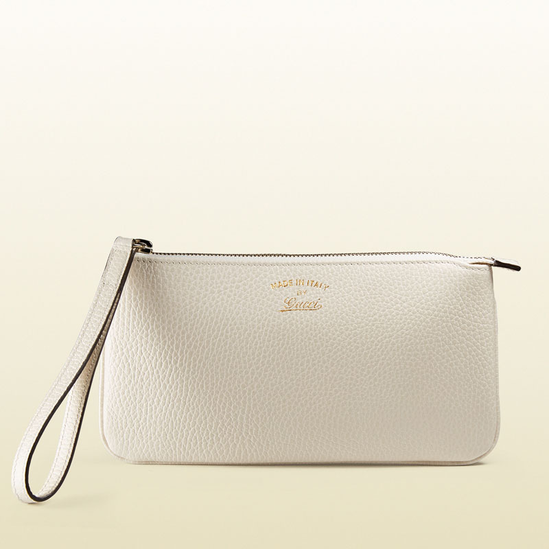 - off-white leather- embossed gold gucci trademark- top zip closure with coordinating leather pull- 8.9"W x 4.7"H x 1"D