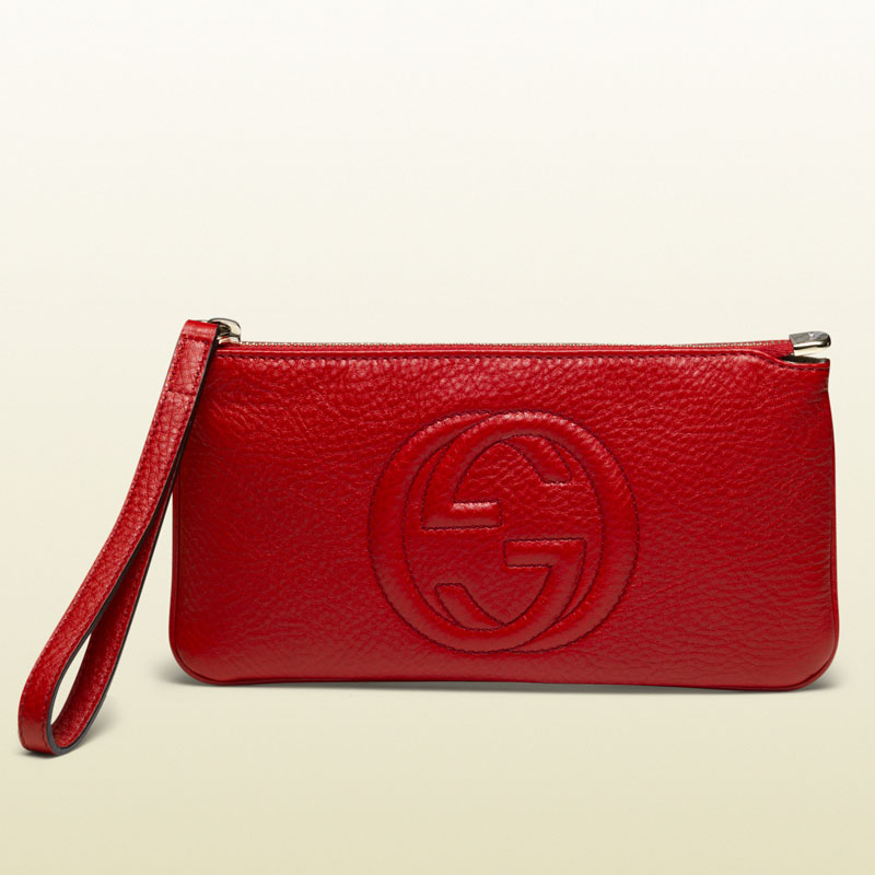 - red leather- embossed interlocking G detail- top zip closure with coordinating leather pull- 8.9"W x 4.7"H x .6"D