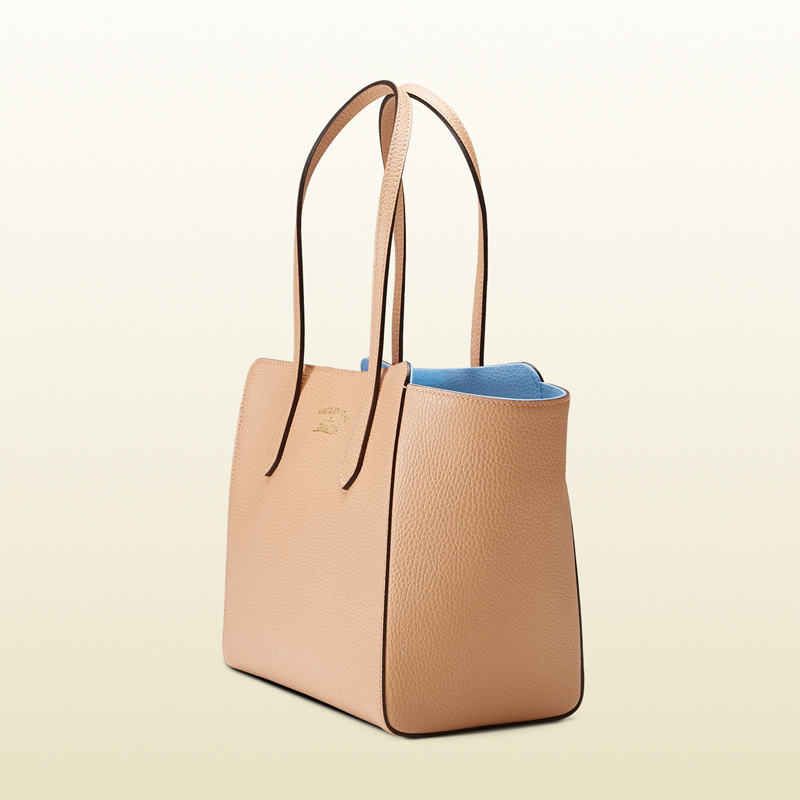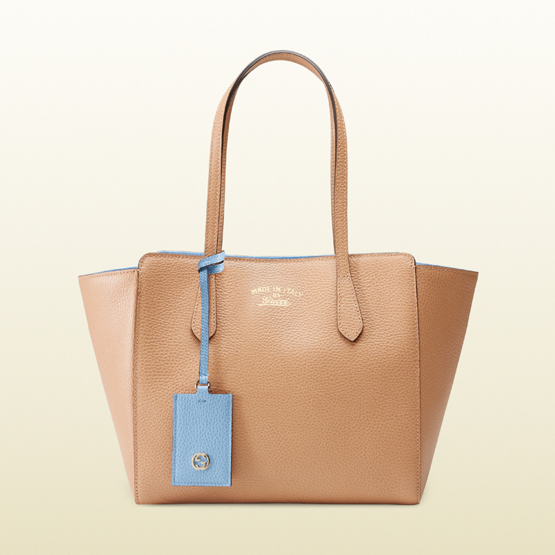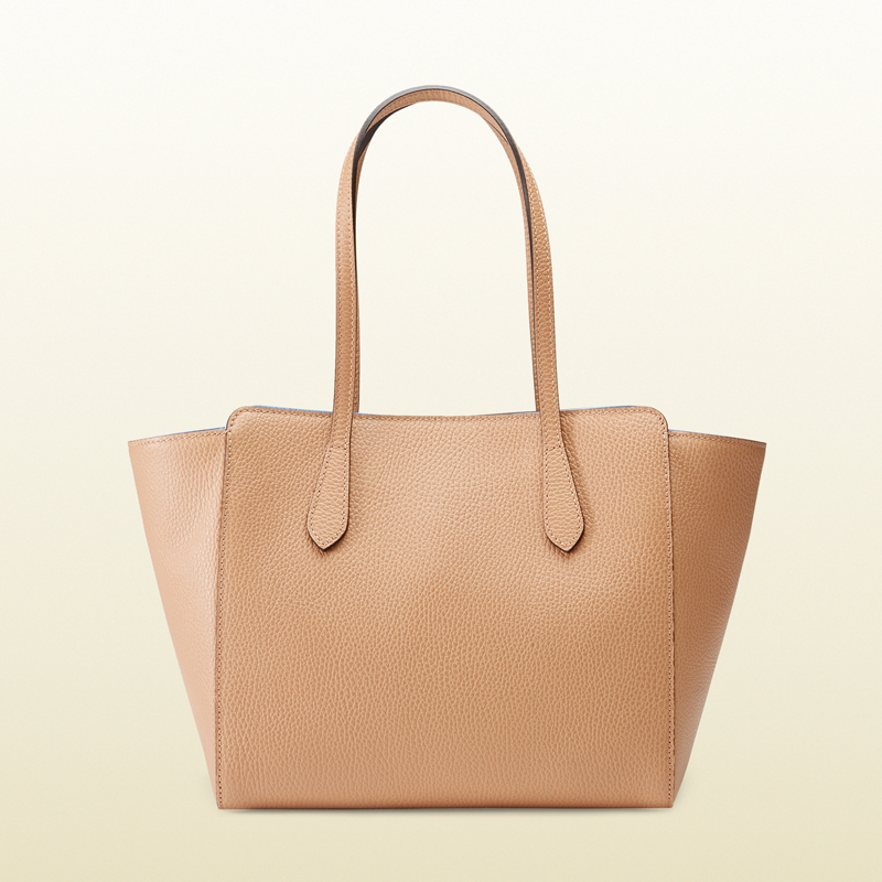 designed with daywear in mind our small gucci swing tote is delightfully dependable with the perfect amount of interior space. crafted in our resistant, textured leather.