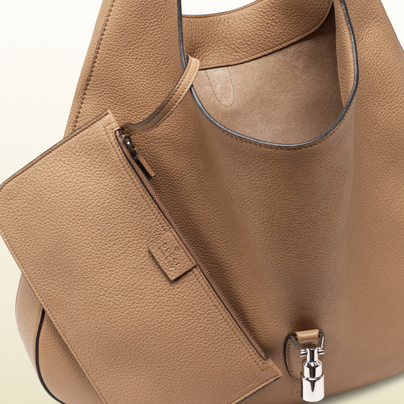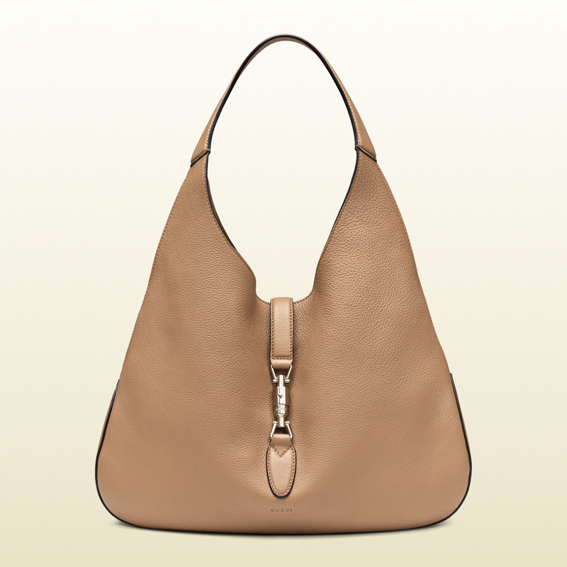 an elegant update of a gucci icon, the jackie soft hobo is undeniably chic. crafted in supple leather with a classic piston closure, the style is as versatile as it is feminine. there is an unexpected thickness to our soft grain leather, which gives this bag beautiful structure while maintaining its slouchy shape. the inner side was specially sueded to act as a protective interior.
