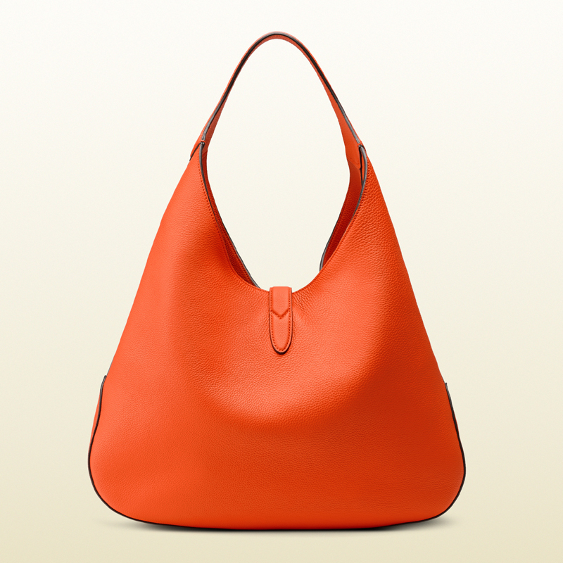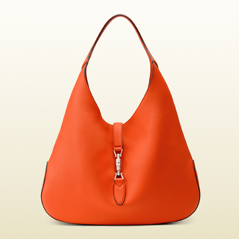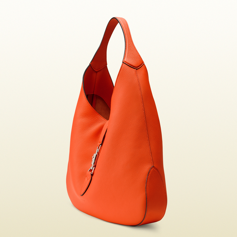 an elegant update of a gucci icon, the jackie soft hobo is undeniably chic. crafted in supple leather with a classic piston closure, the style is as versatile as it is feminine. there is an unexpected thickness to our soft grain leather, which gives this bag beautiful structure while maintaining its slouchy shape. the inner side was specially sueded to act as a protective interior.