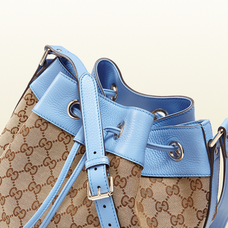 in a shape that has become the new handbag staple, this mid-size bucket bag blends our classic gg canvas with vivid seasonal hues.