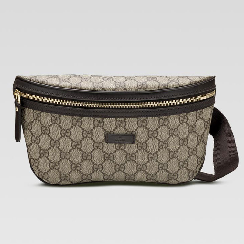 -adjustable waist or shoulder strap in dark brown web with gucci trademark engraved -clip closure