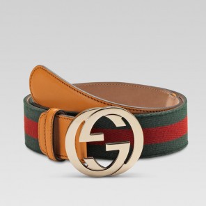 - green/red/green signature web with light tobacco leather trim - light gold hardware - 4 cm width