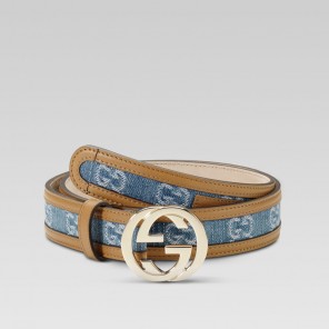 - denim GG fabric with camel brown leather trim - light gold hardware - 1.2" width