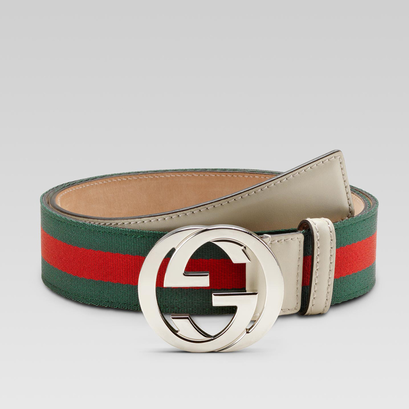 - green/red/green signature web with off-white leather trim - silver hardware - 1.6" width