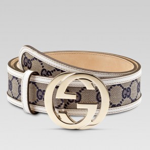 - beige/blue GG fabric with white leather trim - light gold hardware - 1.6" width