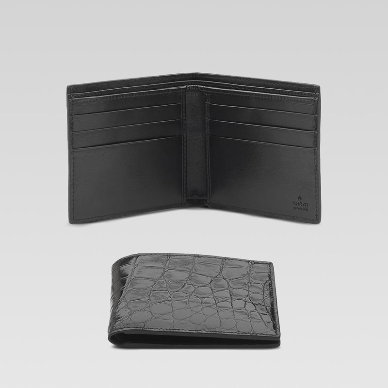 -black crocodile with black leather trim/interior-six card slots and two bill compartments