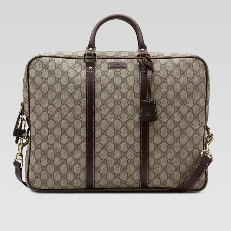 -beige/ebony GG plus with brown leather trim-light gold hardware-double handles-double zip closure with lock-inside zip pocket-strap sold separately