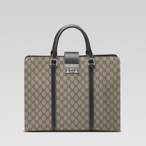 - beige/ebony GG plus with brown leather trim - silver hardware - double handles - push lock closure - double gussets - inside zip, mobile phone, and pda pockets