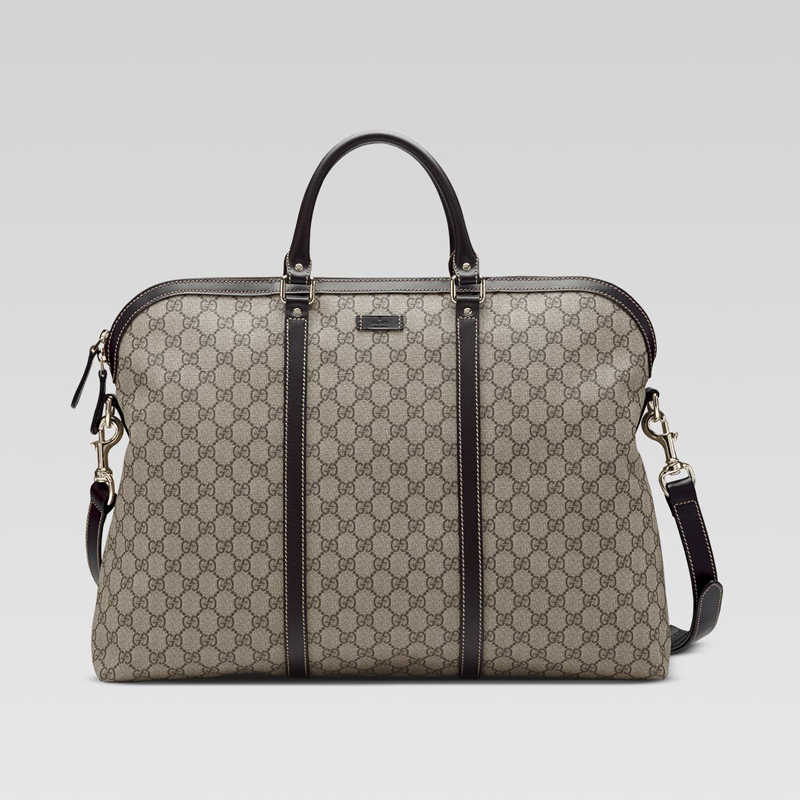 briefcase with double handles, adjustable/detachable shoulder strap, zip-top closure, and inside zip pocket.