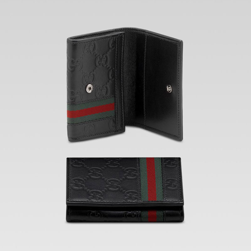-black guccissima leather with green/red/green signature web and black leather trim/interior-snap closure-three card slots