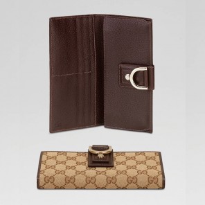 -beige/ebony GG fabric with brown leather trim/interior-light gold hardware-tab snap closure-six card slots and one bill compartment-coin pocket
