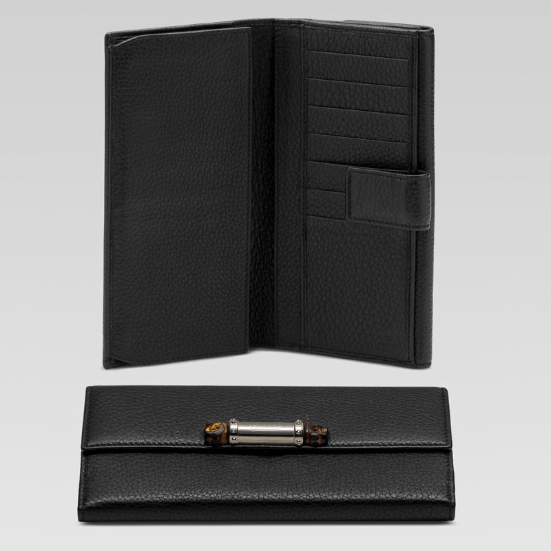 continental wallet with bamboo and engraved gucci script bullet detail.