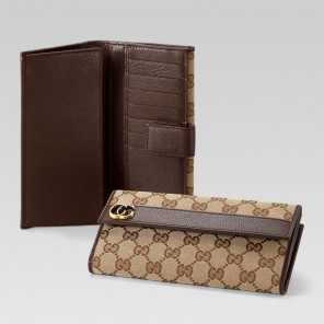 - beige/ebony GG fabric with brown leather trim/ interior - antique brass hardware - snap closure - seven card slots and two bill compartments - coin pocket
