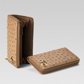 - website exclusive - light brown ostrich - antique brass hardware - zip around closure - twelve card slots and three bill compartments - zip coin pocket