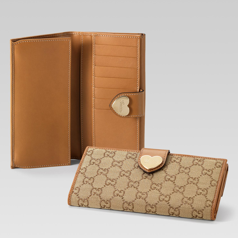 continental wallet with engraved gucci script logo heart detail.