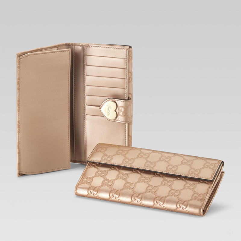 continental wallet with engraved gucci script logo heart detail.